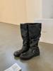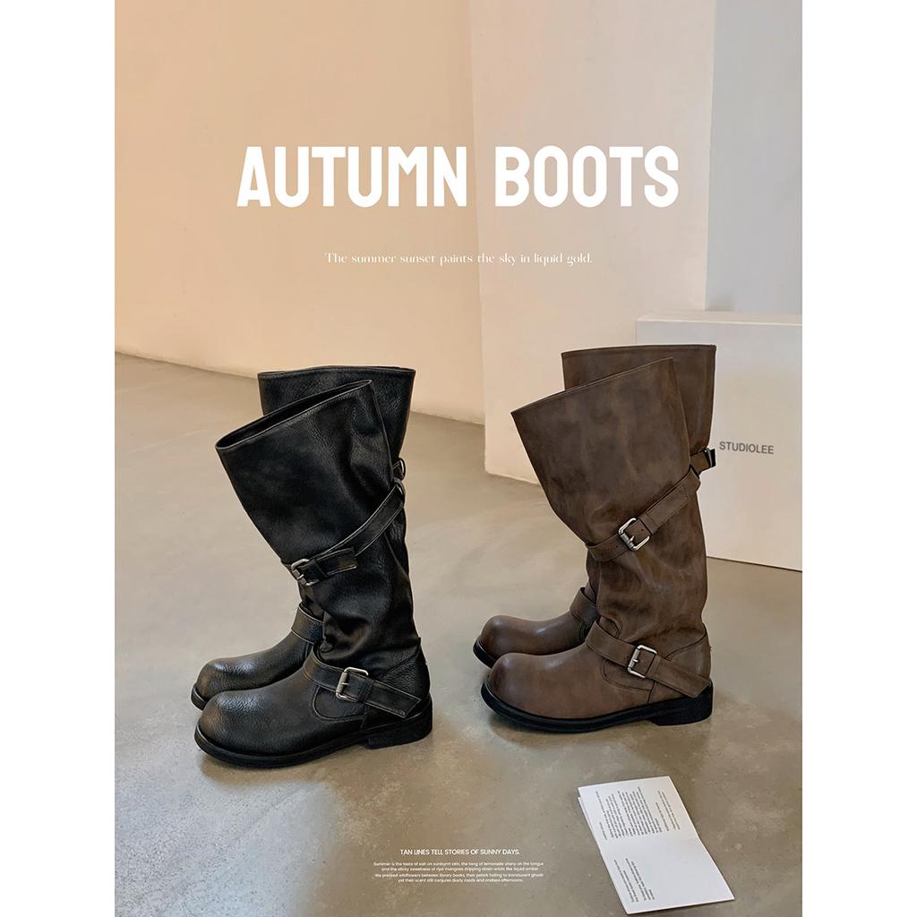Grape Mom Studiolee Western Spice Girls~ Double Belt Buckle Round Trousers Boots Thick Heel Tall Knight Boots