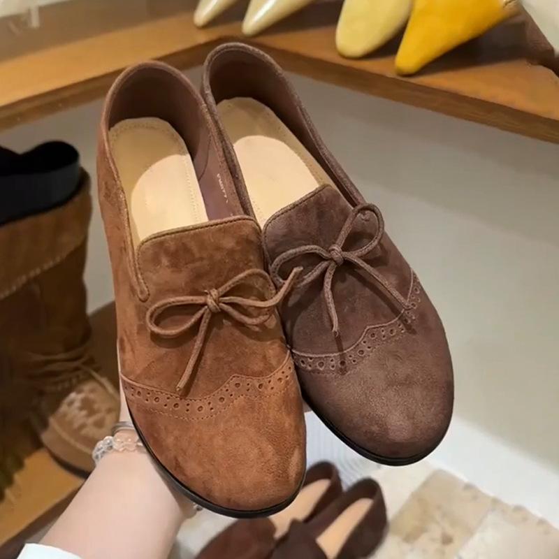 Cowhide version~ Korean version of genuine leather round head flat bottom small leather shoes women's retro suede bow Brock single shoes women's tide