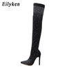 Eilyken Design Crystal Rhinestone Stretch Fabric Sexy High Heels Sock Over-the-Knee Boots Pointed Toe Pole Dancing Women Shoes