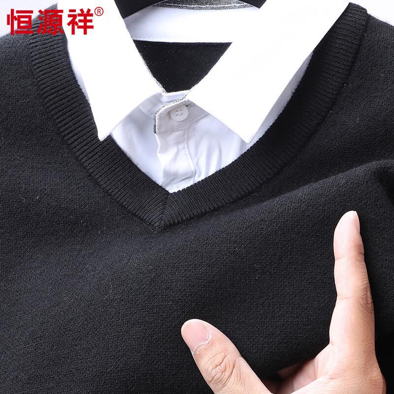 Hengyuanxiang Men's Thickened 100% Wool Fake Two-Piece V-Neck Sweater with Shirt Collar
