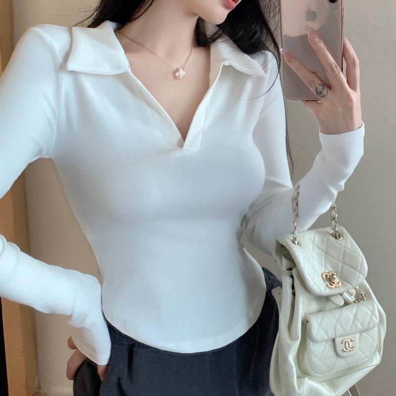 Curved V-Neck Long Sleeve Slim Fit Women's Korean Top – Sweet & Spicy Trendy Style