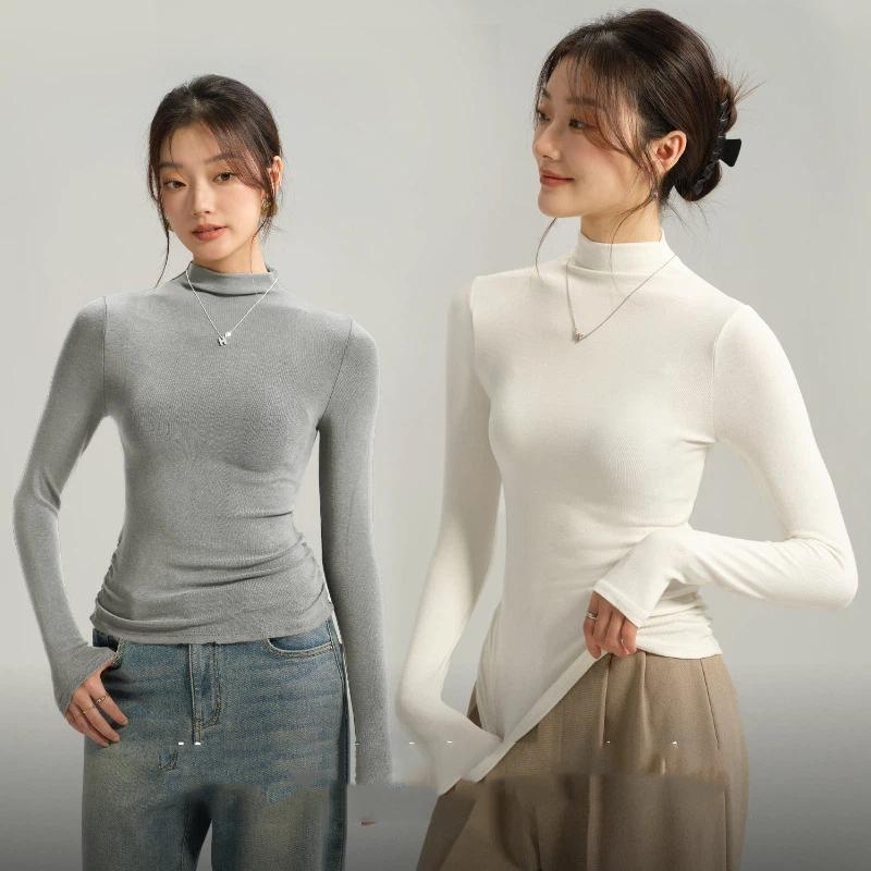 Women's Autumn And Winter Inner Wear Long Sleeved Base T Shirt Top Semi High Neck Solid Color Base Shirt