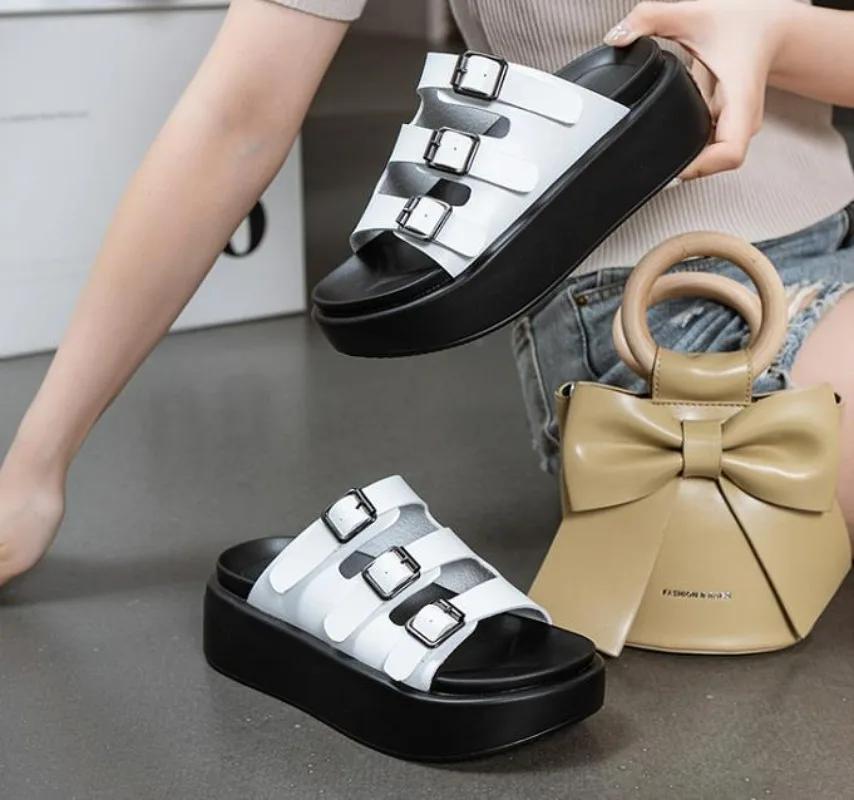 Móda 7cm Nová Kráva Pravá Kůže Syntetické Dámské Pantofle Dámské Letní Otevřená Špička Vysoká Značka Sandály Boty Platforma Klínek Móda