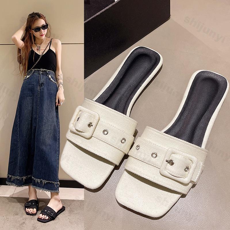 Fashion Cowboy Women Slippers Flats Sandals 2025 Summer Designer Flip Flops Outdoor Fashion Dress Casual Square Toe Buckle Beach Shoes