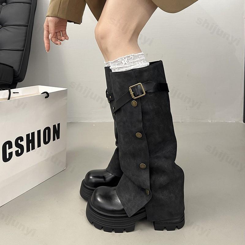 Fashion Women's Comfortable Knee-high Boots 2025 Autumn Fashion Belt Buckle Long Boots Mid-Heel Round Toe Outdoor Platform Botas Mujer