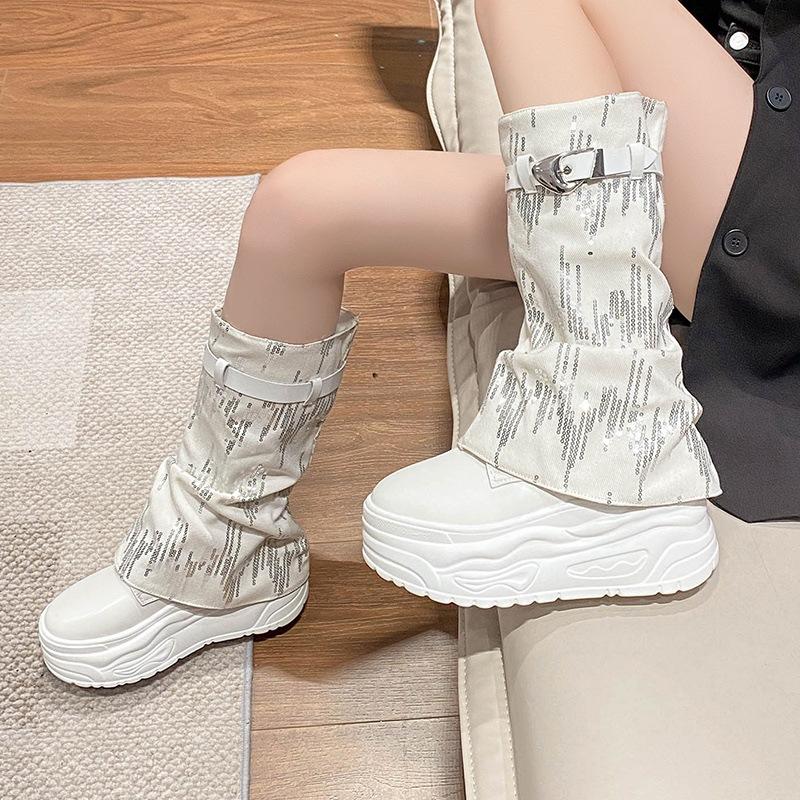 Fashion Fashion Women's Shoes Thick Soled Mid-calf Boots Round Head Sequin Platform Sneakers Autumn Bling Western Long Botas for Women