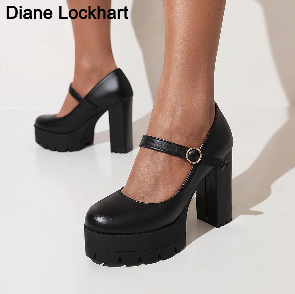 Fashion Spring Autumn Women Pumps Mary-Jane Platform Black Beige Chunky 10.5CM High Heels Ankle Strap Dress Party Hoof Heel Plus Size