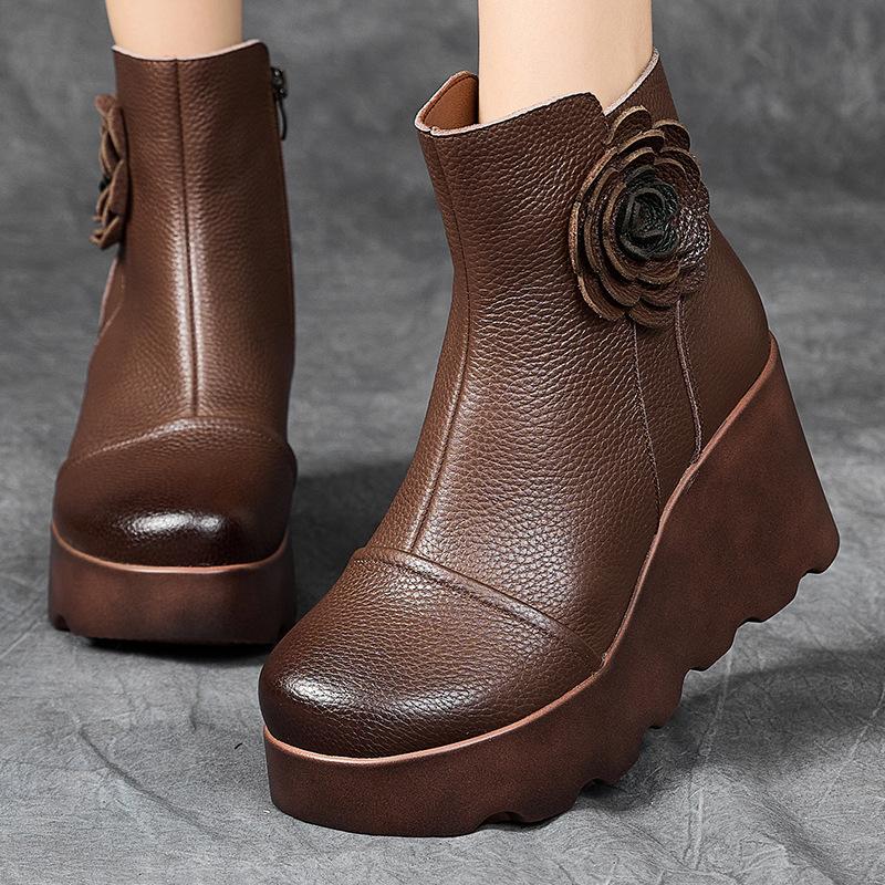 Fashion Top quality 8CM Women Winter Warm Plush Boots National Style Flower Retro Handmade Wedges Height Increasing Platform Ankle Boots