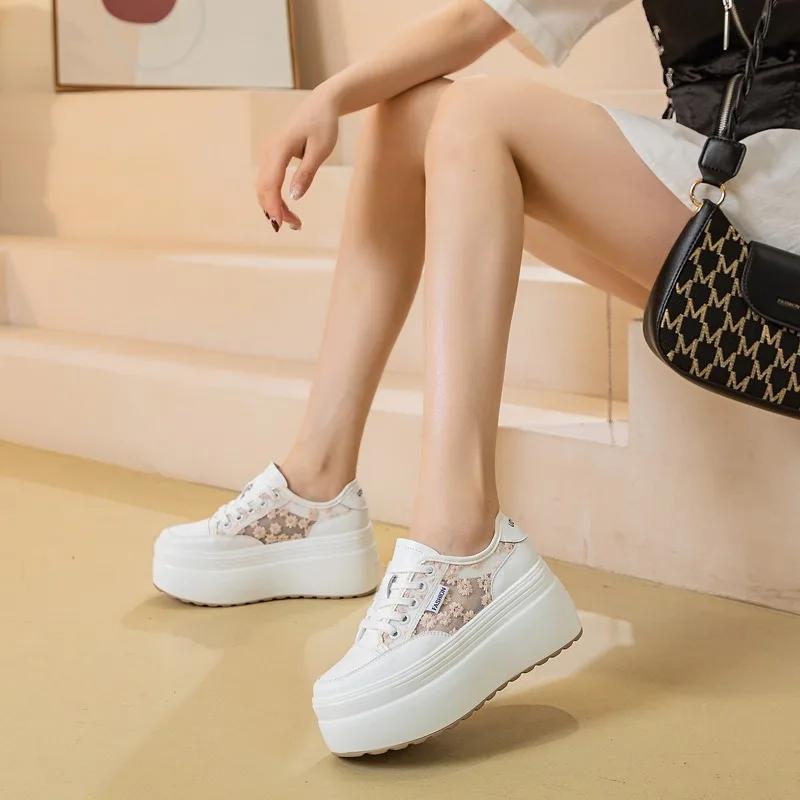 Fashion Hot sale 8cm Air Mesh Genuine Leather Embroider Women Breathable Hollow Chunky Sneaker Platform Wedge Flats Shoes Summer Sandals