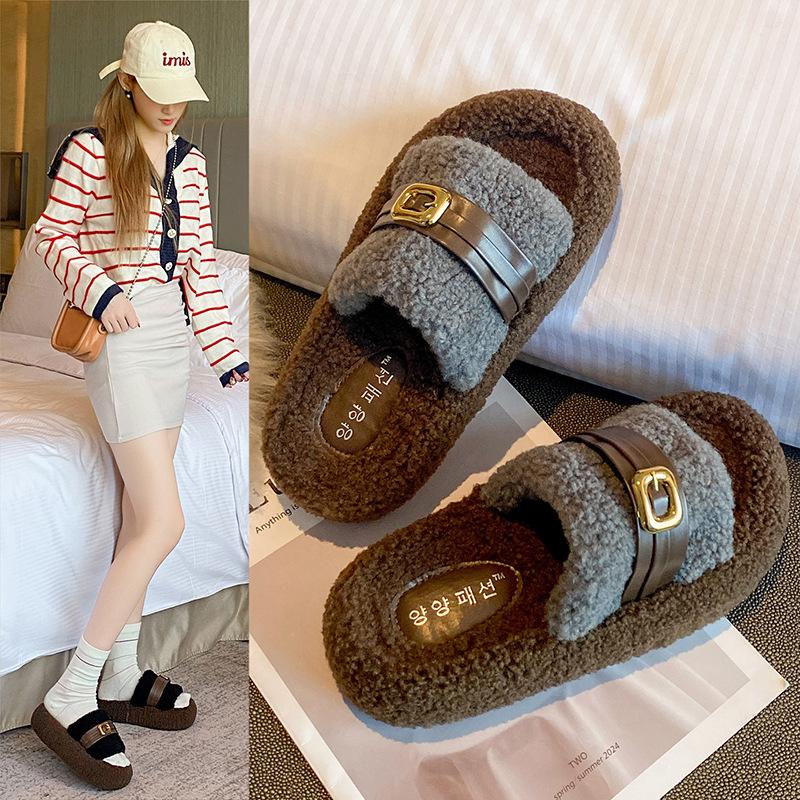 2025 new wool shoes women's winter wear soft-soled slippers lamb wool belt buckle velvet warm women's shoes