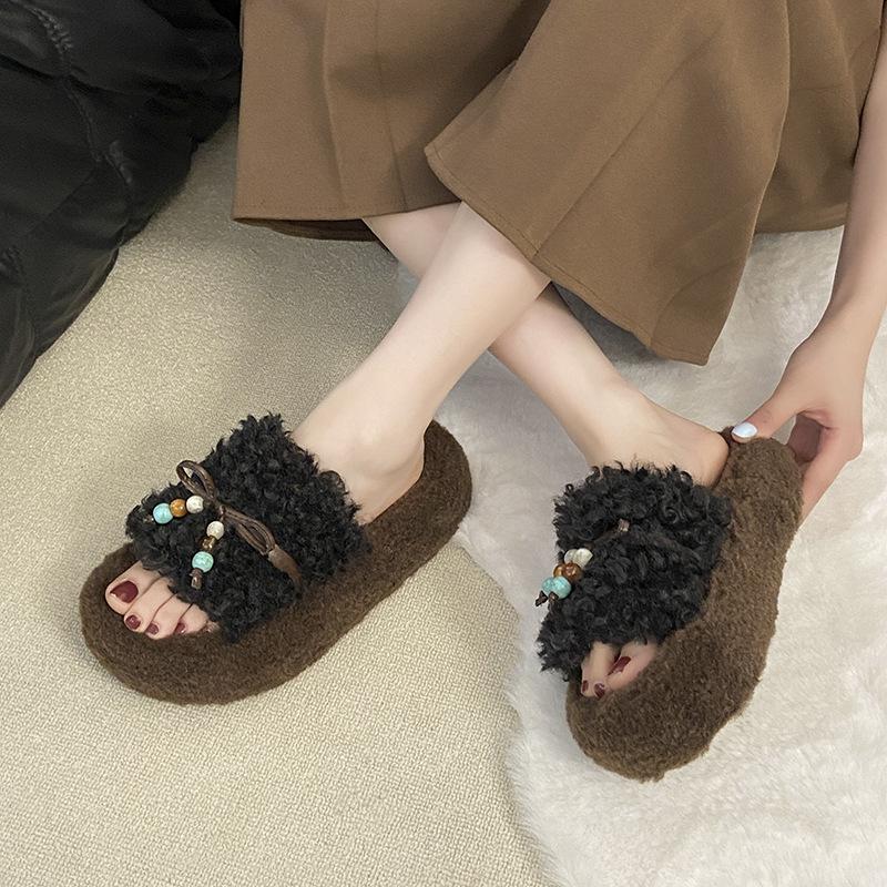 Dámské huňaté pantofle se silnou podrážkou na nošení ven na podzim a zimu 2025 nová móda ven malé muffinové rolády plyšový bavlněný mop