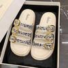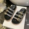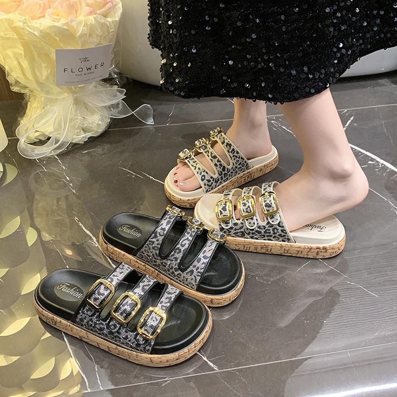 Retro flat-bottomed one-word women's cool slippers with square buckle, new thick-soled leopard print cool slippers for summer 2025