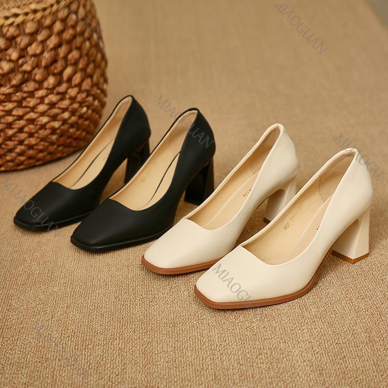 Fashion Spring New Women's Pumps Retro Shallow Mouth Square Head Thick High Heels Work Shoes Commuting Beige Black Women Single Shoes