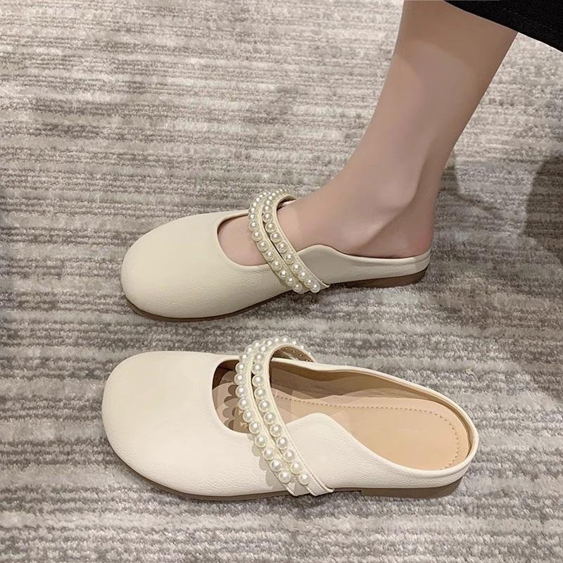 Baotou half slippers women's summer wear 2025 new fashion Internet celebrity pearl half support single shoes soft sole fairy sandals