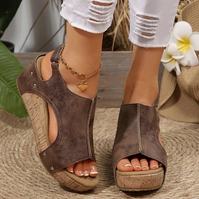 Módní dámské sandály Retro nýtová dekorace Sandály na vysokém podpatku Římský styl Boty na klínku s otevřenou špičkou pro ženy Venkovní protiskluzová plážová obuv