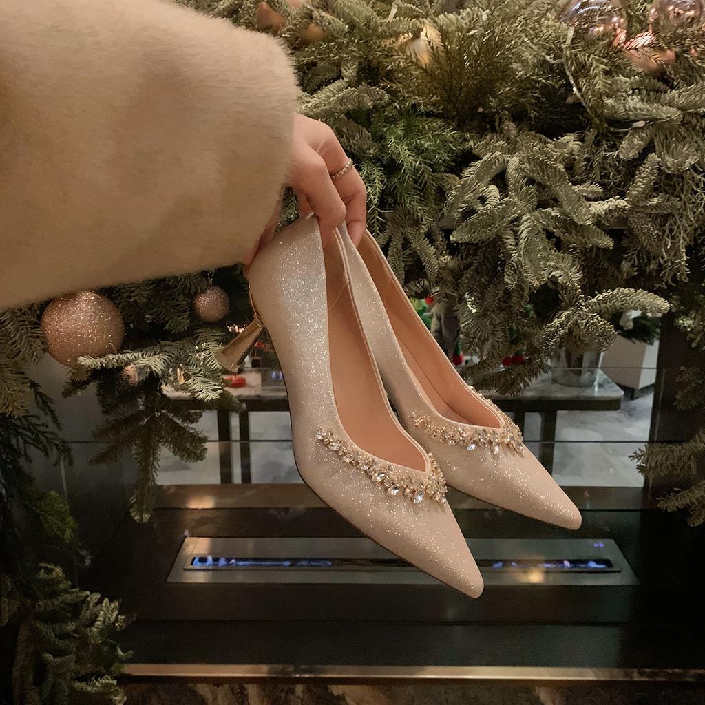 Sheepskin version of grape mother, the same sparkling rhinestone single shoes, women's French temperament, pointed head, thin heel, shallow mouth, w