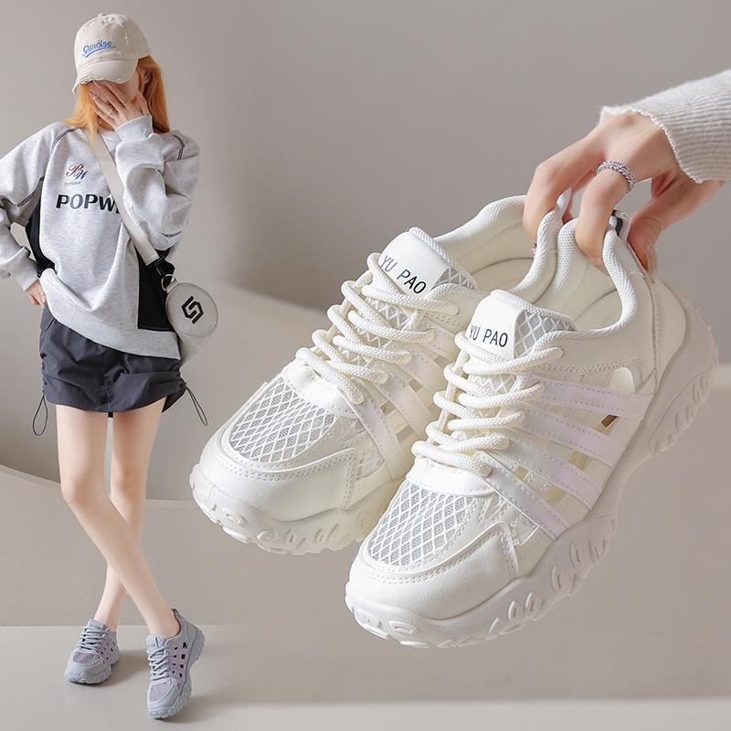 Leather mesh breathable dad shoes 2025 summer new women's shoes thick-soled hole hollow casual sports shoes