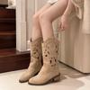 Módní duté vyšívané vintage westernové boty dámské 2025 podzim robustní podpatky ke kolenům kovbojské boty žena PU kůže rytířské kotníkové boty