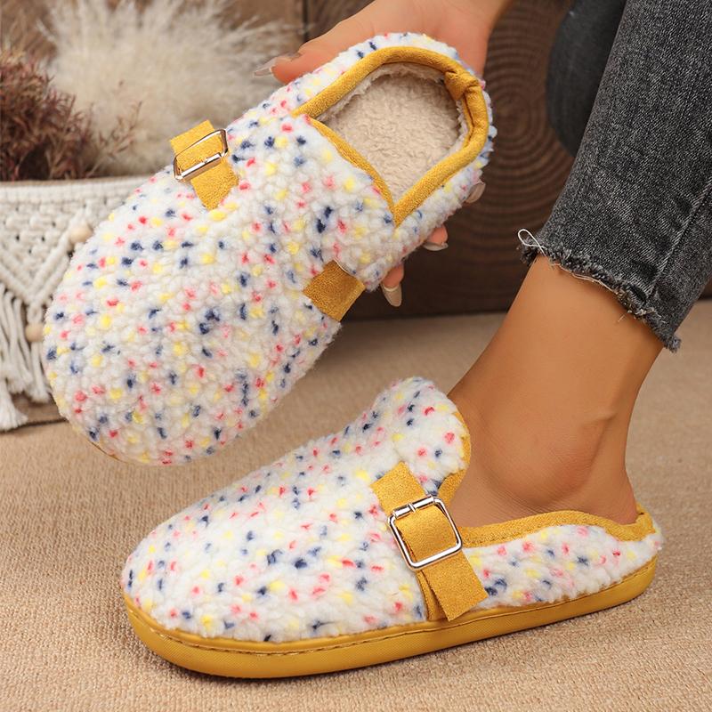 Fashion Fashion Mix Color Plush Slippers Women Round Toe Slip On House Cotton Slippers Woman Winter Buckle Strap Detor Fur Slides Ladies