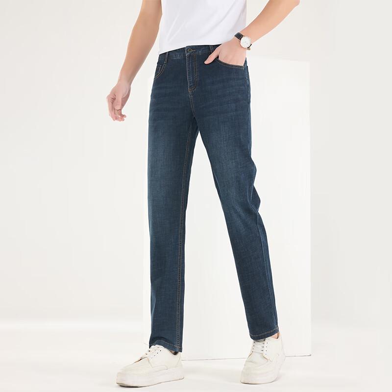 These Fengmao men's straight-leg denim jeans are designed for versatile, casual wear during spring and summer. Featuring a classic blue color and a solid pattern, they offer a comfortable fit with a natural waist and slight elasticity. Made from a durable blend of cotton, polyester, regenerated cellulose fiber, and spandex, these regular-thickness long pants come with a convenient zipper fly. Suitable for youth and middle-aged men seeking a stylish and comfortable everyday option.