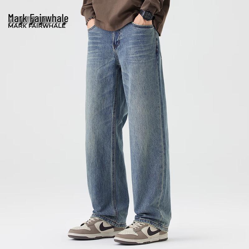 These Mark Fairwhale men's jeans feature an American-style, straight-leg, and loose-fit design, perfect for everyday wear and versatile styling. Made from a comfortable washed light blue stretch cotton denim blend (90.3% Cotton, 7.2% Polyester, 1.5% Other fibers, 1.0% Spandex), they offer slight elasticity for enhanced comfort. Designed with a natural waist and zipper fly, these full-length jeans are suitable for various casual occasions during the autumn and winter seasons.