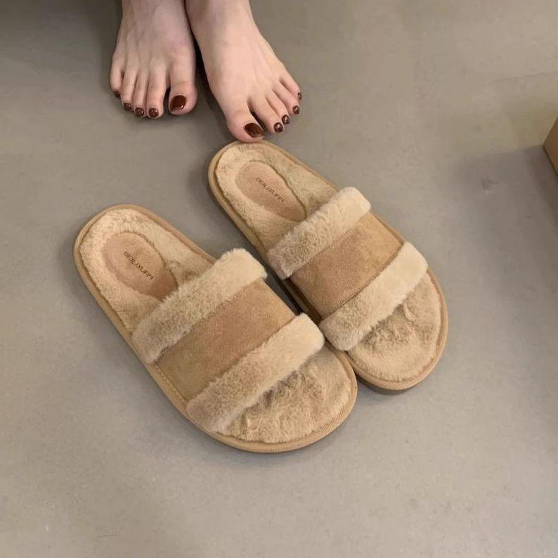 Retro one-word fluffy slippers women's outer wear 2025 autumn and winter new Korean version gentle fairy temperament flat bottom velvet half drag