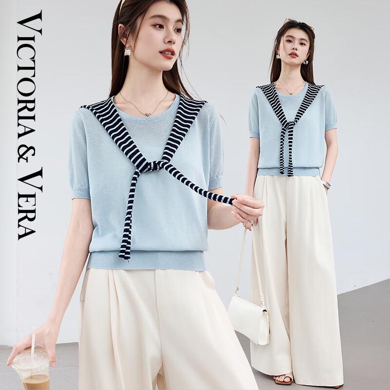 VICTORIA&VERA Women's Striped Shawl Hooded Faux Two-Piece Knit Top