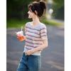 Sancai Women's 2025 Summer Hollow-Out Crochet Striped Square Neck Short Sleeve Knit Top