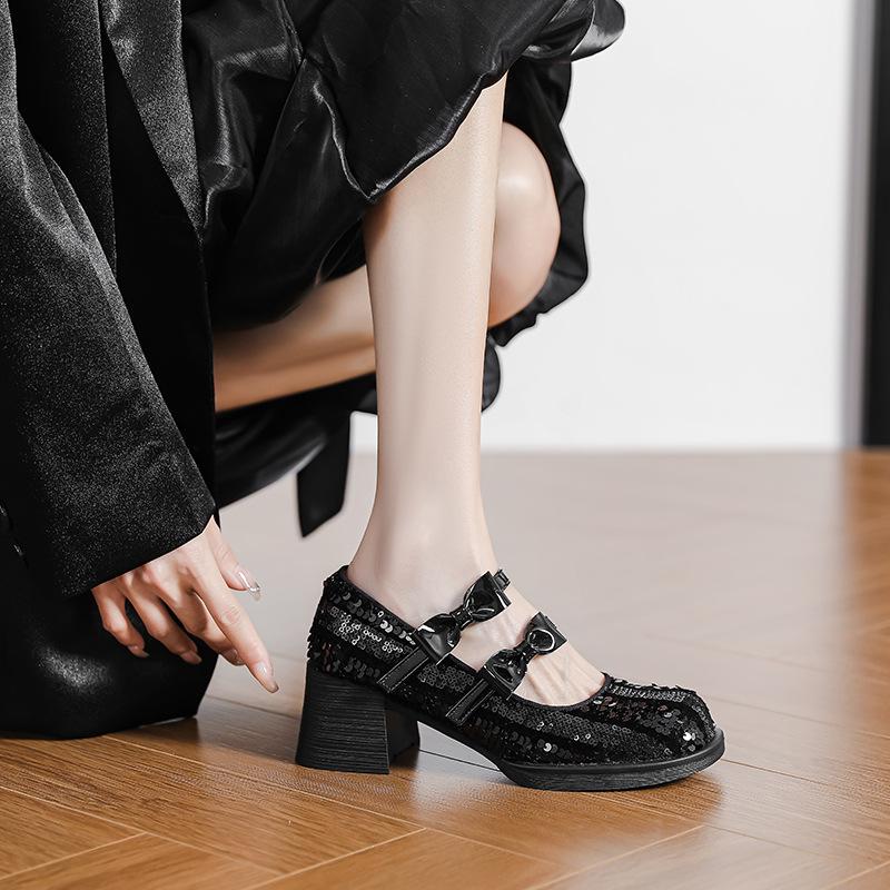 High-heeled Mary Jane women's shoes 2025 spring and autumn new round head thick heel butterfly sequins light mouth word with black single shoes