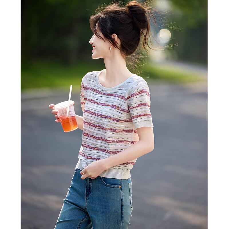 Women's Striped Hollow-Out Knit Short Sleeve T-Shirt
