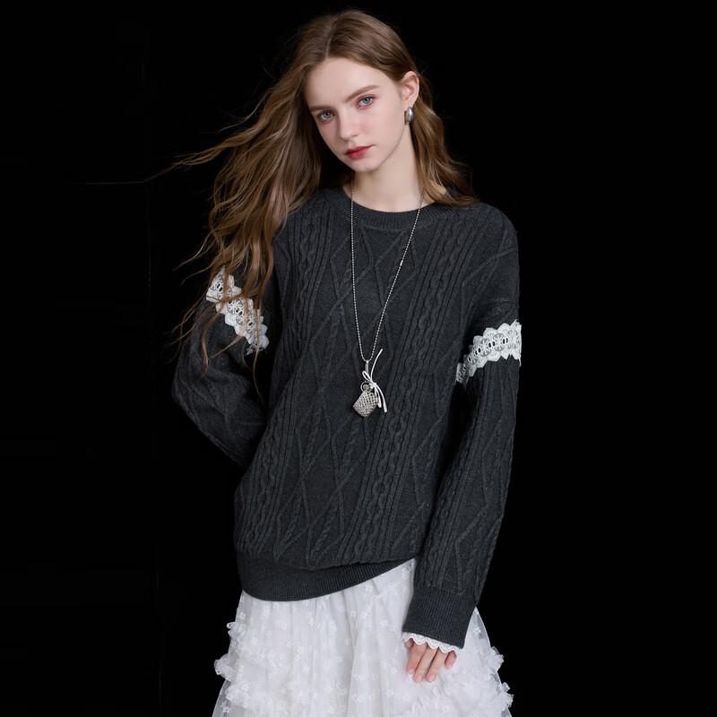 Sancai 2025 Winter Round Neck Cable Knit Sweater with Lace Trim