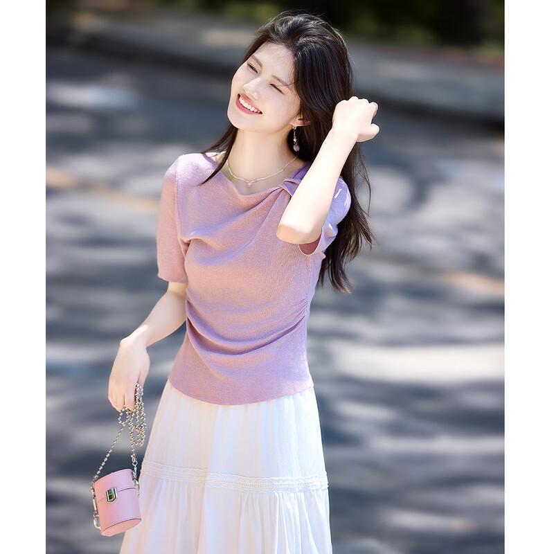 Women's Elegant Pleated Short-Sleeve Knit Top