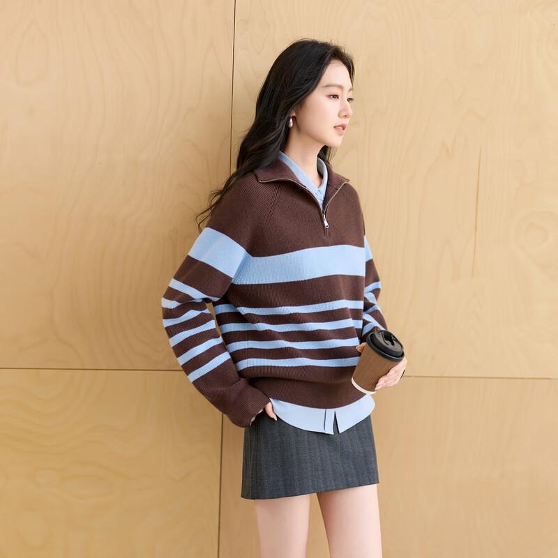 Sancai 2025 Autumn Striped Knit Sweater with Zipper Turn-down Collar