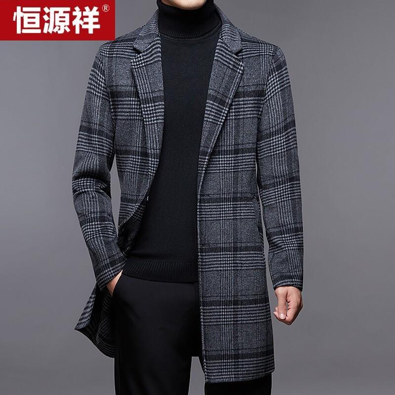 Hengyuanxiang Men's Mid-length Plaid Double-faced Wool Overcoat