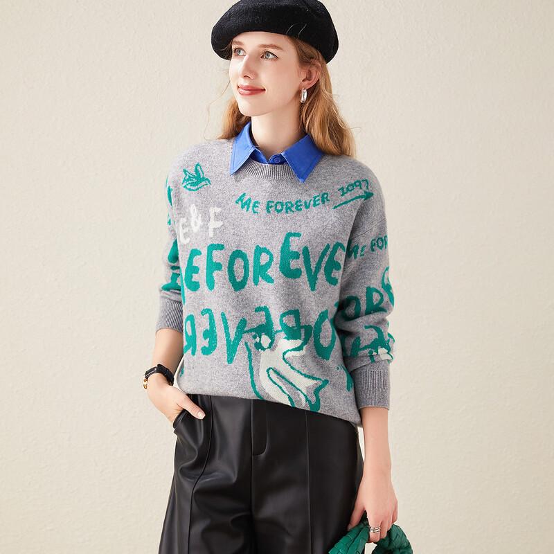 TUHUANG Women's Thickened Pure Wool Letter Jacquard Round Neck Sweater