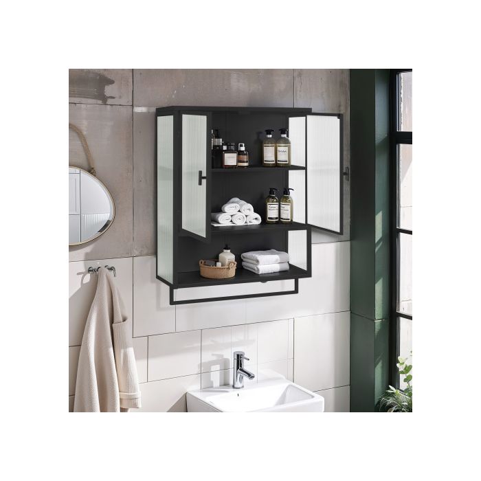 Armoire contemporaine à double porte vitrée, largeur 60 cm, avec étagères ouvertes et porte-serviettes, finition noire.