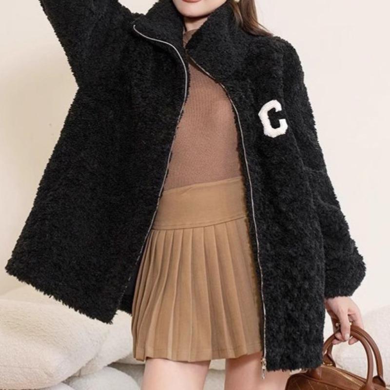 Light coral fleece jacket women's autumn and winter thickened thermal sweater women's outer wear women's embroidered double-sided fleece trendy black