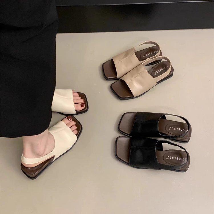 Real soft leather flat bottom with sandals for women's summer wear 2025 new simple and advanced French retro open-toed cool