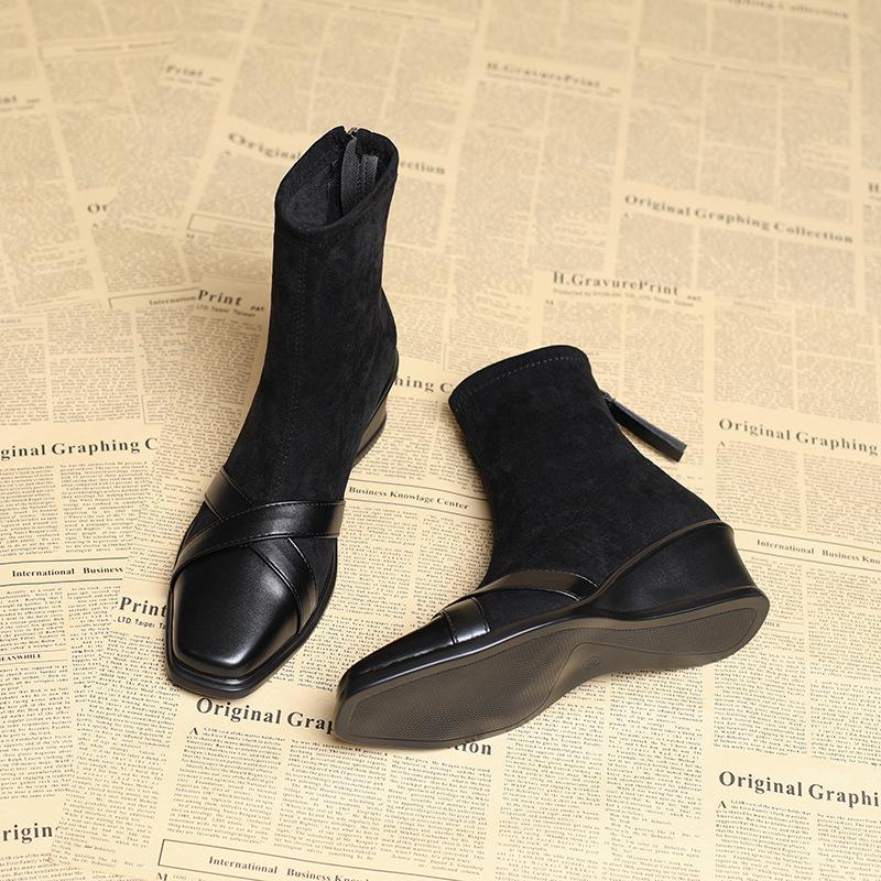 European and American square head suede cross-spell fashion boots for women's winter new temperament thin boots rear zipper short boots for women