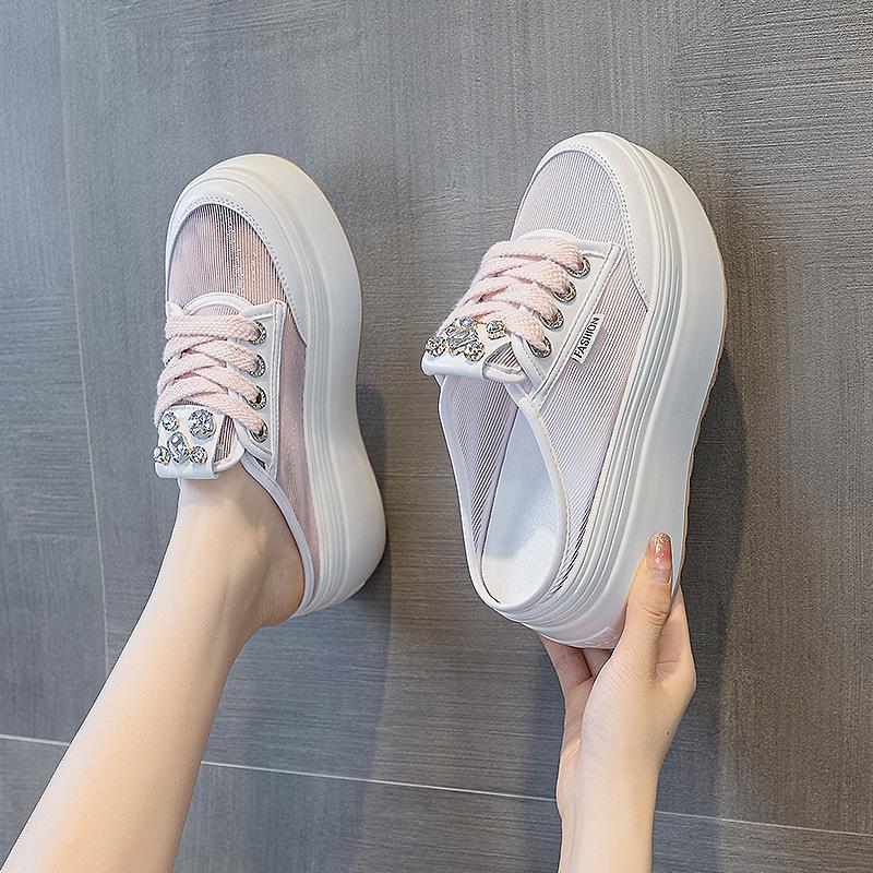 Baotou slippers women's shoes will be popular in 2025, breathable mesh yarn, rhinestone thick sole will increase by 8 cm, fashion trend is versatile