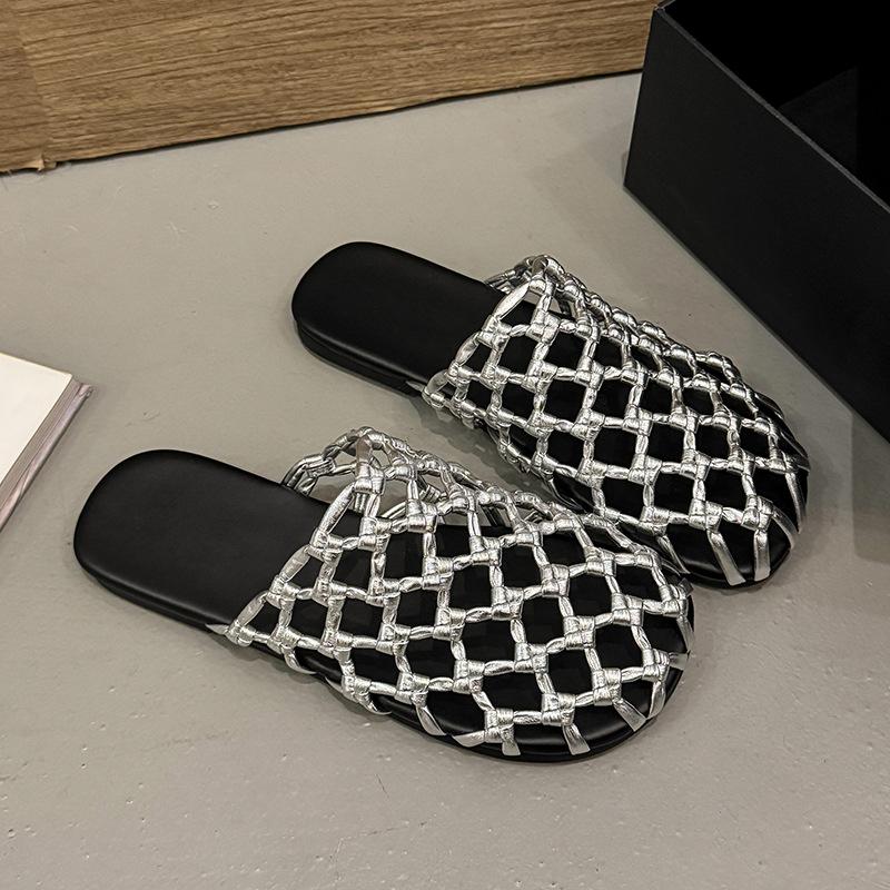 Summer New Breathable Mesh Weaving Baotou One Pedal Flat Bottom Cool Slippers Casual Versatile Women's Shoes
