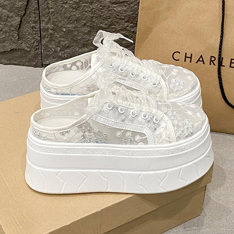 Fashion 8CM Women's Slippers 2025 New Bling Summer Women's Platform Slippers Lace Rhindiamonds High Toe Closed Slippers Women Mule Shoes