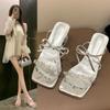 Dámské pantofle Luxusní kamínkové boty na vysokém podpatku Pantofle s mašlí pro ženy 2025 Léto Nové vysoké podpatky Sandalias Mujer