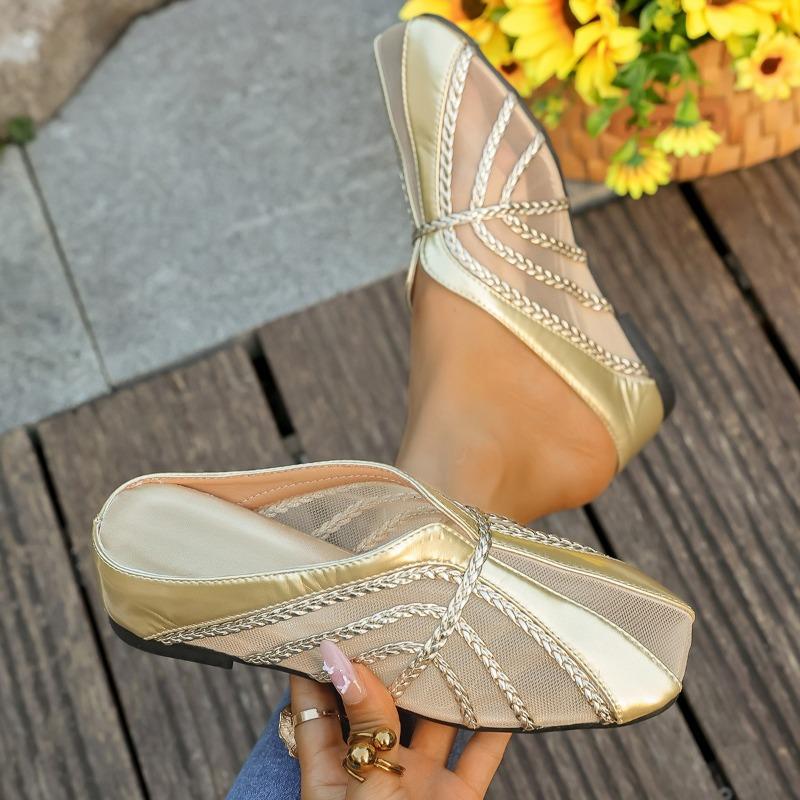 Inner Heightened Mesh Hollow-out Stitched Leather Wrapped Half Slippers Women's New Summer Square Toe Mid-heel Cool Mop