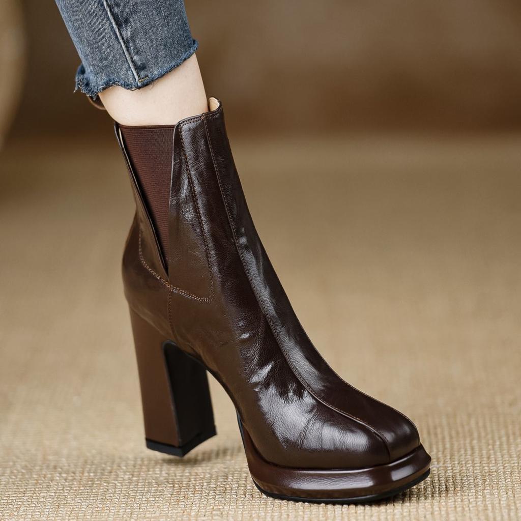 Waterproof table thick heel 2025 autumn new foreign style versatile comfortable high heel boots elastic heightening short boots brown