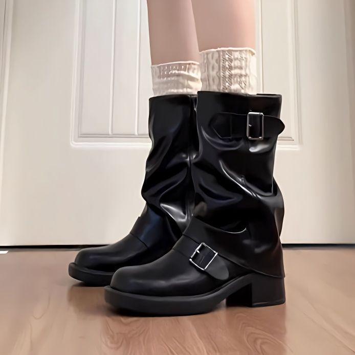 Retro sleeve thick-soled thick-heeled trouser boots women's 2025 autumn new versatile belt buckle pleated pile knight boots