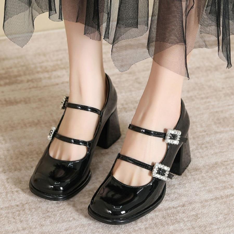2025 Ultimate foreign style one-word buckle French Mary Jane high heels women's small size square head thick heel widened large size single shoes
