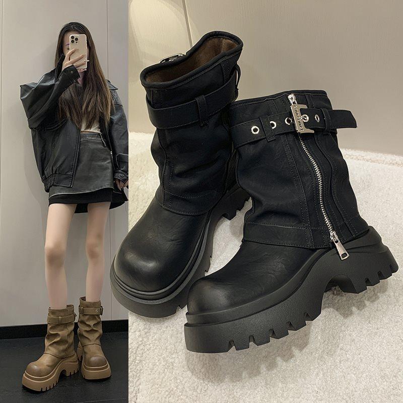 Versatile retro sleeve Martin boots women's medium tube fashion temperament design thick sole niche autumn and winter fashion boots black