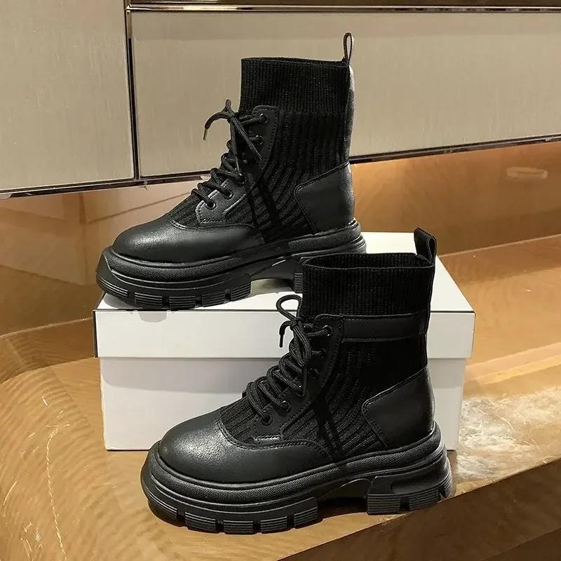 Dámské kozačky Létající pletenina Podzim Zima Nové Kulatá špička Šněrovací Vysoký podpatek Pohodlné Krátké kozačky Plochý podpatek Kotníkové kozačky