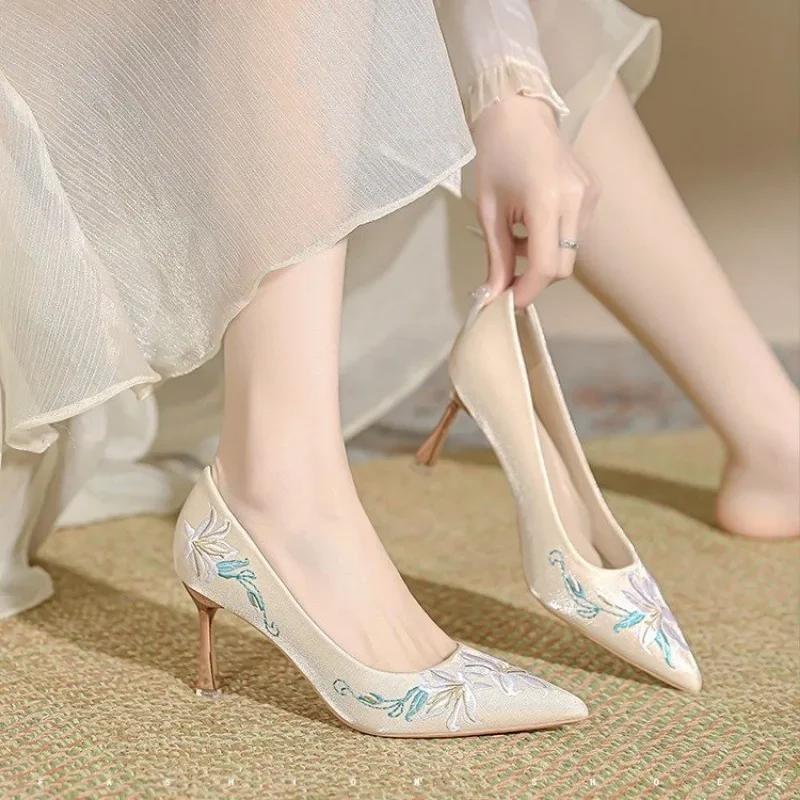 2025Autumn New Thin Heel Single Shoes Women's Pointed Shallow Mouth Cloth Surface Embroidered Slip-on High Heels